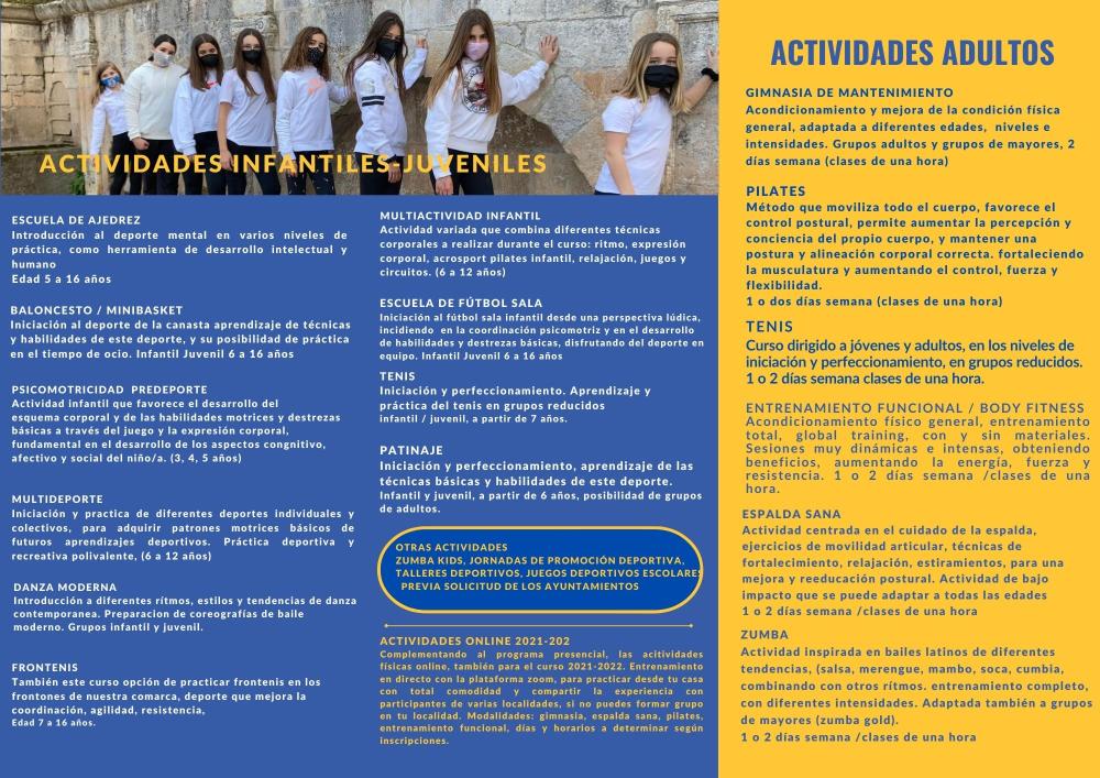 Las actividades se organizan en colaboración con el Ayuntamiento incluyendo una amplia oferta de deportes y actividades físicas para todas las edades: ajedrez, patinaje, tenis, frontenis, fútbol sala, minibasket, danza moderna, multideporte, psicomotricidad, pilates, acondicionamiento físico, entrenamiento funcional, gimnasia de mantenimiento, zumba, espalda sana, multiactividad infantil etc.
